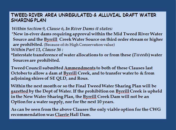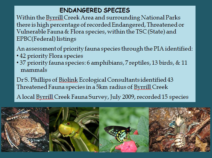 A total of 26 registered sites are on the Bundjalung Mapping Project (BMP), which confirm traditional Aboriginal occupation in proximity to the project area. These sites include open camp fires, artefact scatters, scarred trees and grinding hollows. Grinding hollows are highly significant, as they confirm cultural practices such as food and pigment processing. These sites would be inundated by the Byrrill Creek Dam. A further four new sites were identified during the 2009 PAO; all of which will also be inundated with the proposed dam. The Aboriginal participants of the survey confirmed that pathways, which follow the ridgelines would be cut by the dam. The connectivity of ancient pathways “provides a deeper cultural meaning” and interruption of these was unacceptable to the Aboriginal participants. All Aboriginal participants regarded the area as highly significant, and that: “…..the situation which resulted in a loss of sites during construction of the Clarrie Hall Dam should be avoided at all costs.” and; “It would be important that the water resource remain in the Tweed and not be supplied to other areas.” In the event that this option proceeds, then similar provisions would apply, which were made in relation to the 2008 PAO for the proposed raising of Clarrie Hall Dams, and would include: