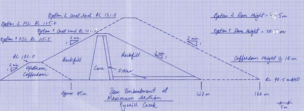 The dam wall would be located at “Byrrill Lagoon ”which is Platypus habitat. It would be an earth & rock fill dam with the spillway height at 40 mts high, (contour level 125-130mts) and 50 mts wide.