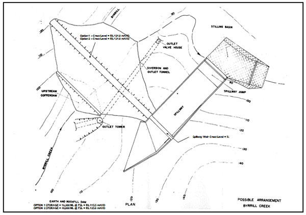 “Byrrill Creek site has some severe geological problems, the main one being the considerable depth of weathering on each abutment. The resultant clayey soil and highly weathered material would make it very difficult to design an effective or economical cut-off structure. The deep weathering in each abutment also commits the site to a fully lined spillway. An extensive program of grouting would be required to establish an effective grout curtain.”